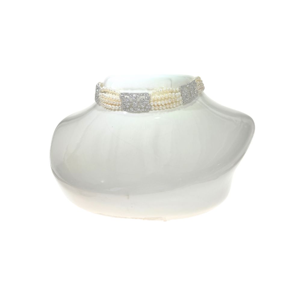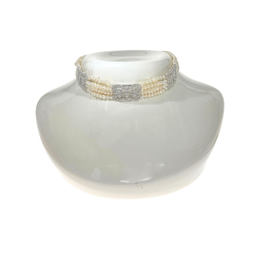 Le collier Rêverie Perlière est un ras-de-cou raffiné composé de quatre rangs de perles, délicatement posé sur le décolleté. Il est sublimé par trois pendentifs d’inspiration vintage et se termine par un fermoir assorti dans le même esprit élégant, offrant une harmonie parfaite dans les moindres détails.