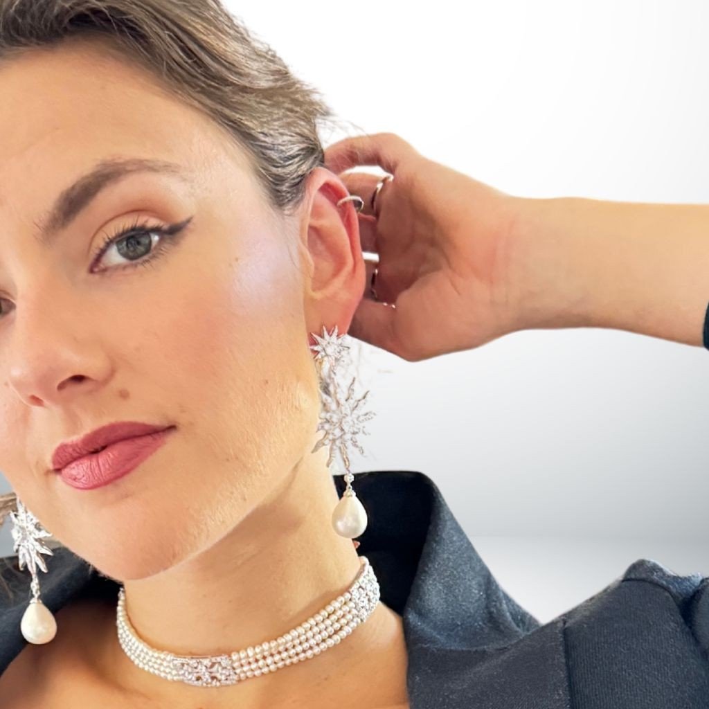 Lumineux et sophistiqué, ce bijou reflète la lumière avec éclat et illumine le visage. À la fois chic et intemporel, il accompagne aussi bien un tailleur de jour qu’une robe de soirée ou une robe de mariée. Une véritable déclaration d’élégance, mêlant romantisme et savoir-faire d’exception.